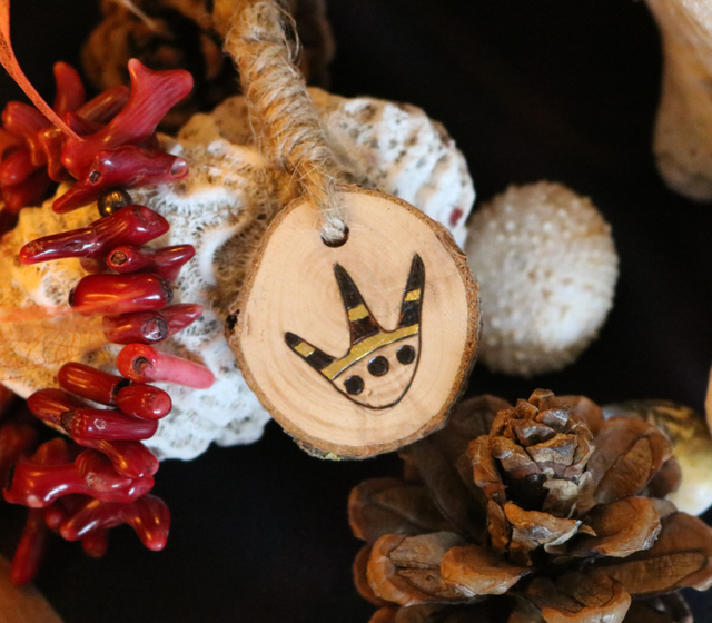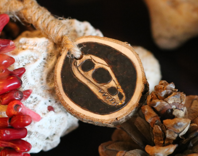 Porte clef pyrogravé à la main. Attache en corde et attache en métal.