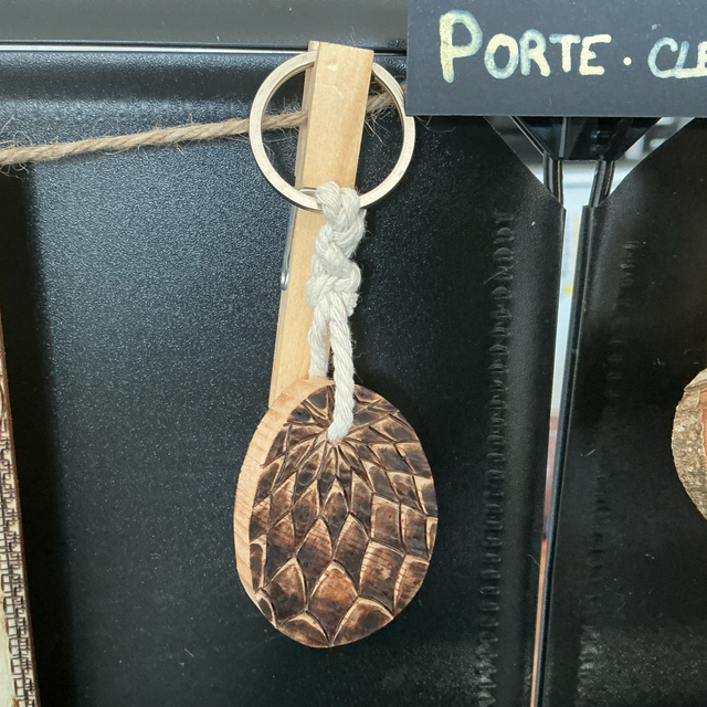 Porte Clef en bois avec corde en macramé. Pyrogravé recto et verso à la main.